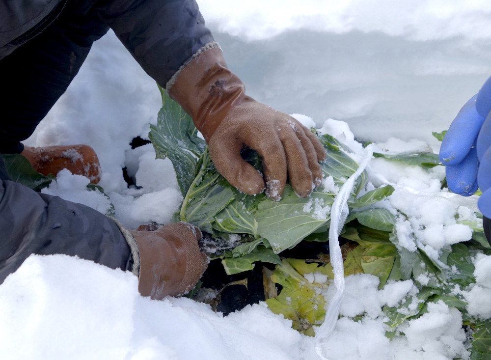 雪の下に大根や白菜が眠っている。それも全部あたごの商品。