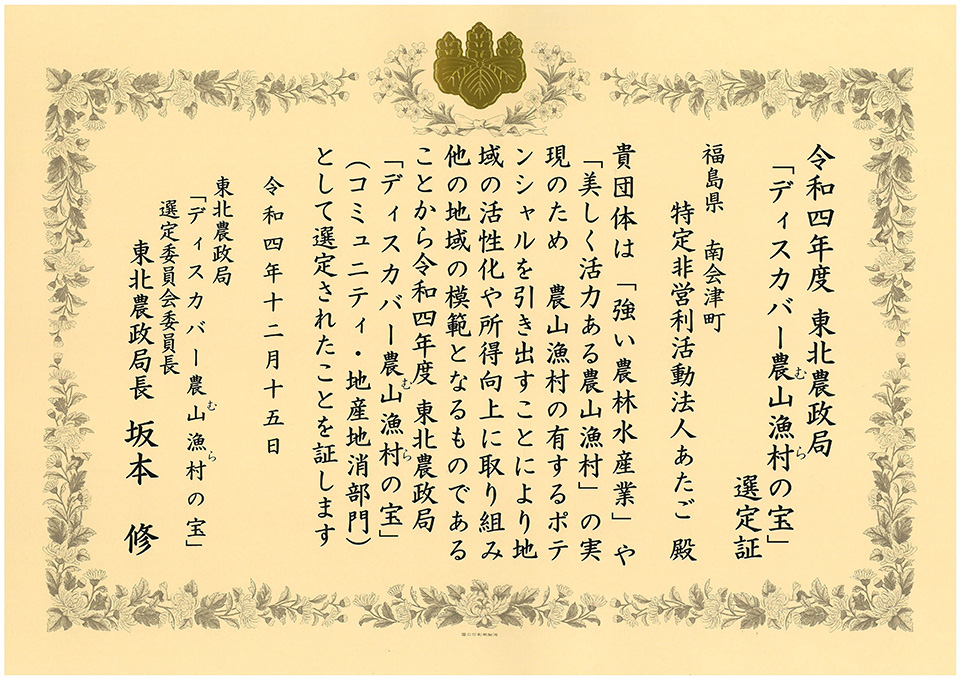 「強い農林水産業」、「美しく活力のある農山漁村」の実現のため、農山漁村の有するポテンシャルを引き出すことにより地域の活性化、所得向上に取り組んでいる優良事例を選定し、全国に発信する「ディスカバー農山漁村(むら)の宝」に選定されました。